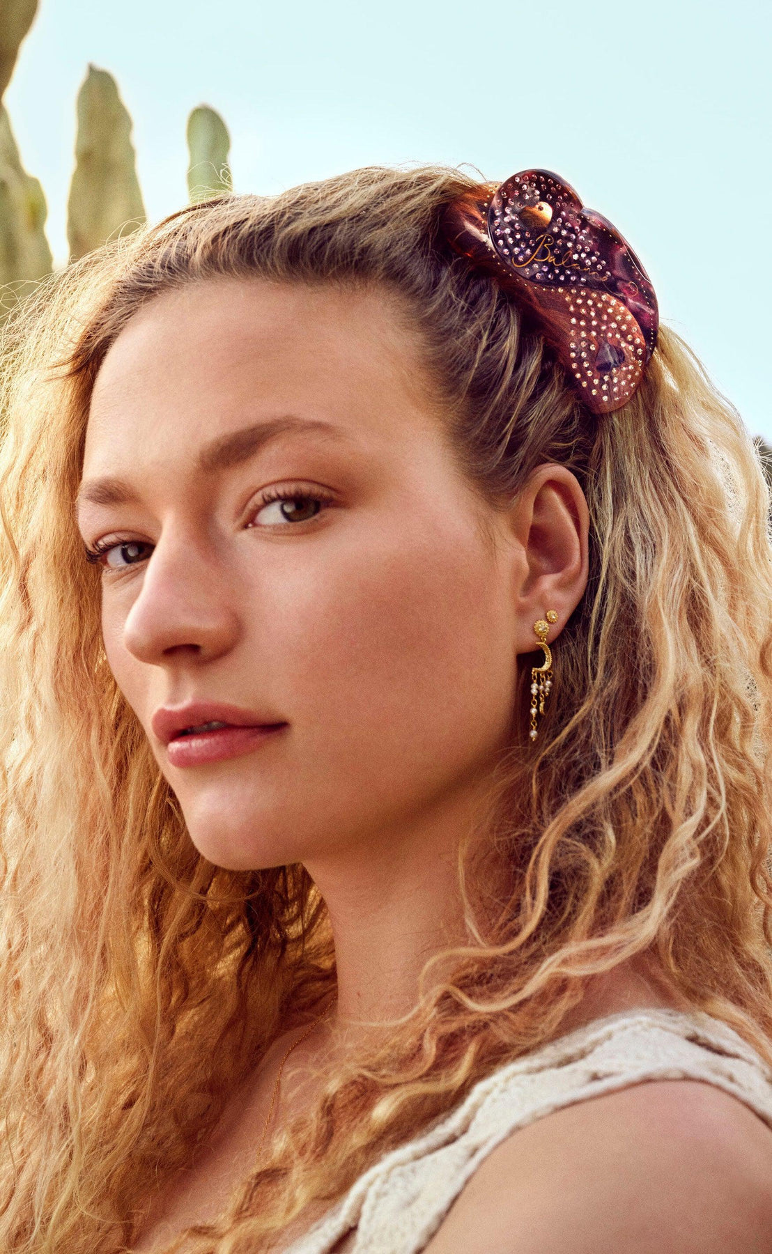 Astrea Øreringene fra Maanesten er et smykke, der kombinerer det mystiske og det feminine. Fremstillet i genanvendt sterlingsølv (925) og belagt med 18 karat guld, prydes de af labradorit og ferskvandsperler, der symboliserer sol og måne – lys og mørke, nat og dag. Øreringene hænger elegant ned langs øret og tilføjer et unikt touch til ethvert outfit.