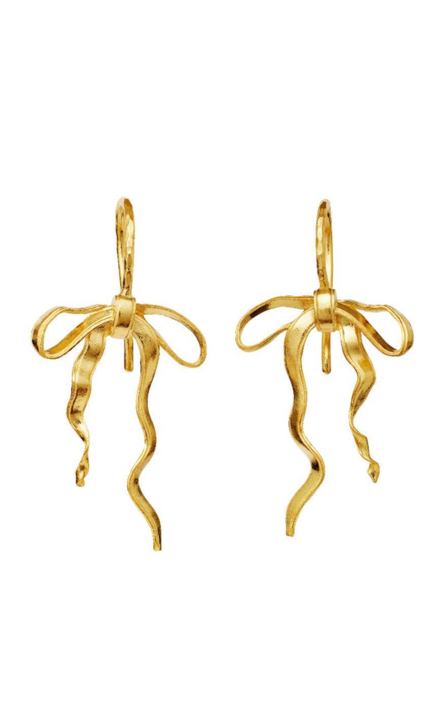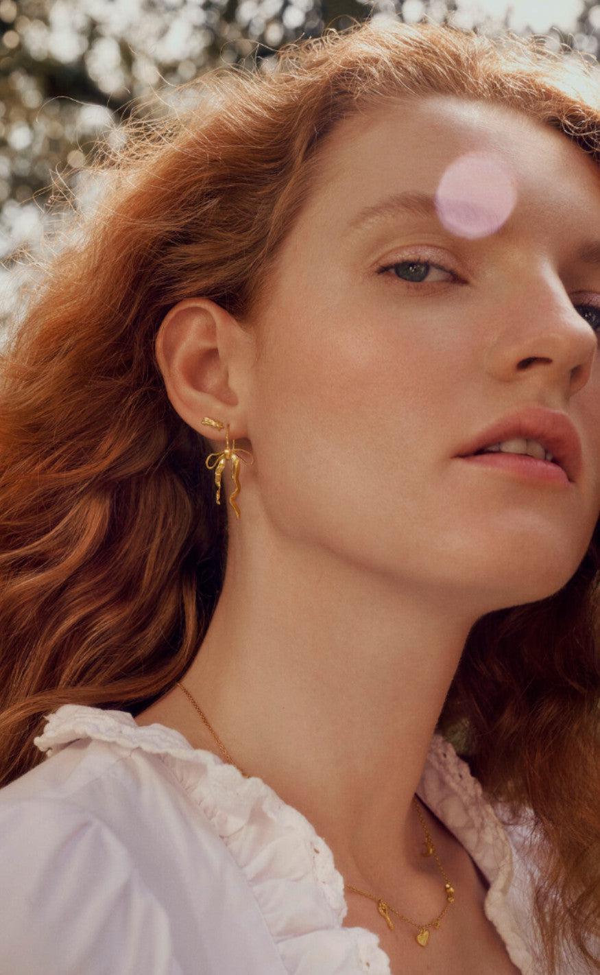 Sanja Øreringene fra Maanesten er en smuk og elegant tilføjelse til enhver smykkesamling. Disse øreringe er fremstillet af genanvendt sterlingsølv (925) og belagt med 18 karat guld, hvilket giver dem en varm og luksuriøs glød. Designet er inspireret af delikate, uperfekte sløjfer, der hænger let og luftigt fra ørerne, hvilket skaber en drømmende og feminin silhuet.